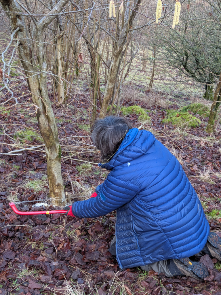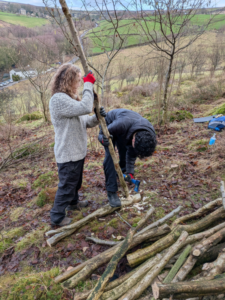 Volunteers used, bow and pruning saws, loppers and billhooks to cut the hazel ‘stools’, which will stimulate the hazel to regenerate and produce ‘rods’ and ‘poles’ subsequently these will be harvested for hedging stakes, bean poles and pea sticks. These coppice products will be available to purchase from Hebden Royd Town Council to fund the on going maintenance of the site.